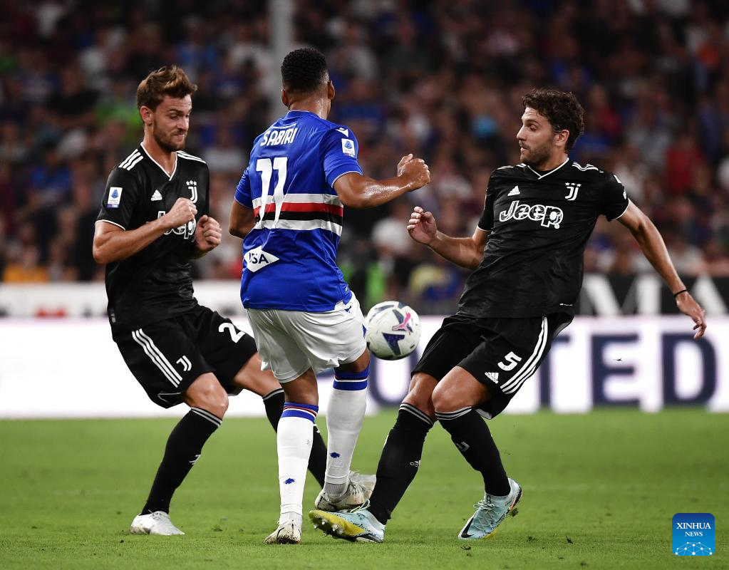 FC Juventus' Daniele Rugani (L) and Manuel Locatelli (R) vie with Sampdoria's Abdelhamid Sabiri during an Italian Serie A football match between FC Juventus and Sampdoria in Genova, Italy, Aug. 22, 2022. (Photo by Federico Tardito/Xinhua)