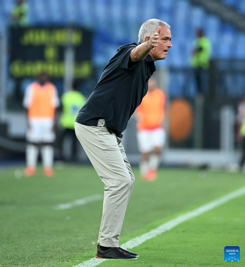 Roma's head coach Jose Mourinho gestures during a Italian Serie A football match between Roma and Cremonese in Rome, Italy, Aug. 22, 2022. (Photo by Alberto Lingria/Xinhua)