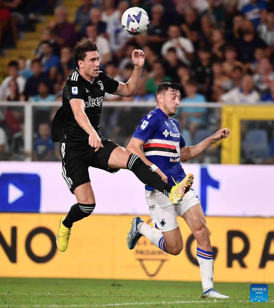 FC Juventus' Dusan Vlahovic (L) vies with Sampdoria's Alex Ferrari during an Italian Serie A football match between FC Juventus and Sampdoria in Genova, Italy, Aug. 22, 2022. (Photo by Federico Tardito/Xinhua)