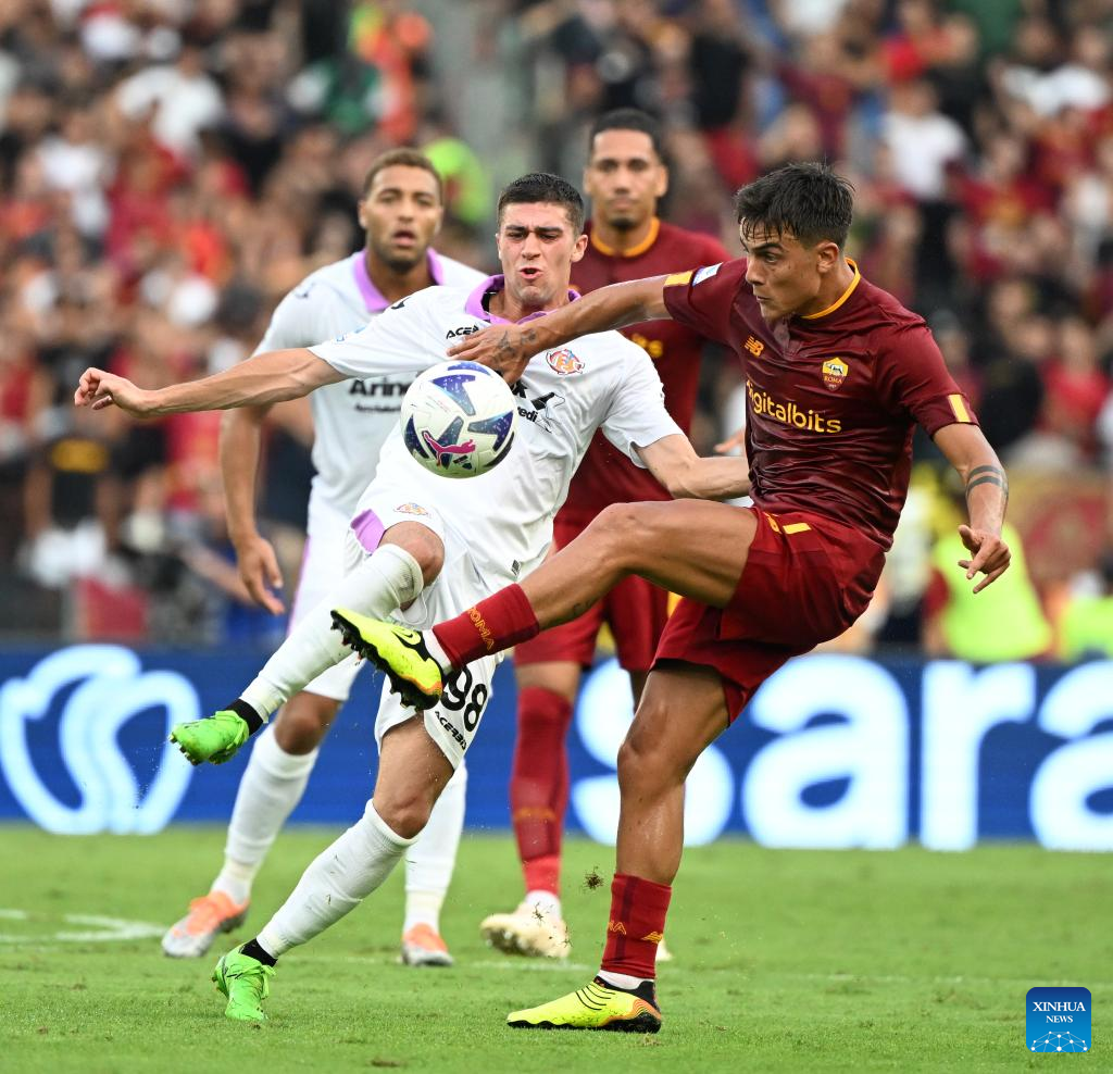 Roma's Paulo Dybala (front R) competes during a Italian Serie A football match between Roma and Cremonese in Rome, Italy, Aug. 22, 2022. (Photo by Alberto Lingria/Xinhua)