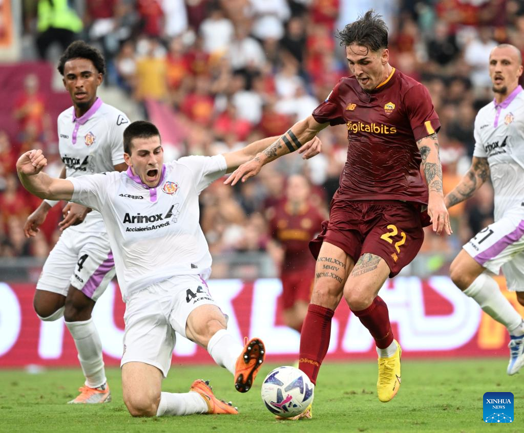 Roma's Nicolo Zaniolo (front R) vies with Cremonese's Luka Lochoshvili during a Italian Serie A football match in Rome, Italy, Aug. 22, 2022. (Photo by Alberto Lingria/Xinhua)