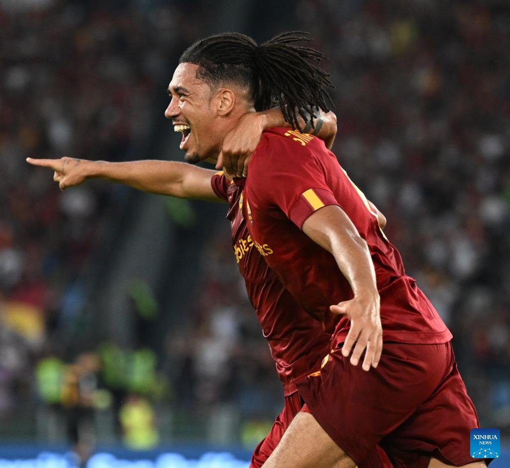 Roma's Chris Smalling (front L) scores his goal during a Italian Serie A football match between Roma and Cremonese in Rome, Italy, Aug. 22, 2022. (Photo by Alberto Lingria/Xinhua)