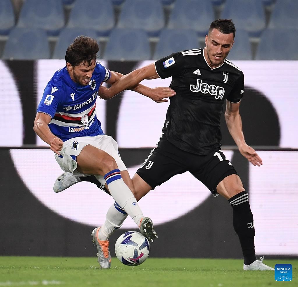 FC Juventus' Filip Kostic (R) vies with Sampdoria's Bartosz Bereszynski during an Italian Serie A football match between FC Juventus and Sampdoria in Genova, Italy, Aug. 22, 2022. (Photo by Federico Tardito/Xinhua)