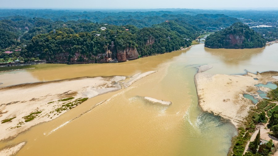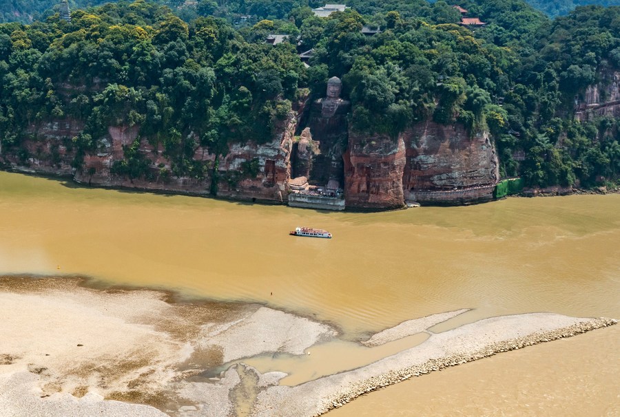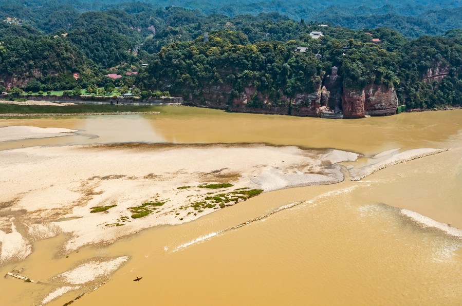 Photo taken with a drone on Aug. 23, 2022 shows the Leshan Giant Buddha with its base section exposed as a result of low water levels in Leshan, southwest China's Sichuan Province. (Xinhua/Shen Bohan) ■