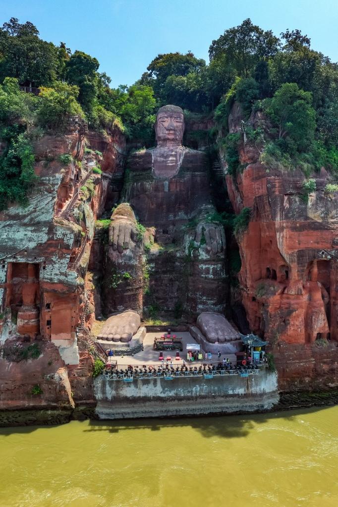 The Buddha statue, carved into a cliff in Leshan Mountain and overlooking three converging rivers, namely the Minjiang, Qingyi and Dadu rivers, was built over a 90-year period beginning in 713 during the Tang Dynasty (618-907).