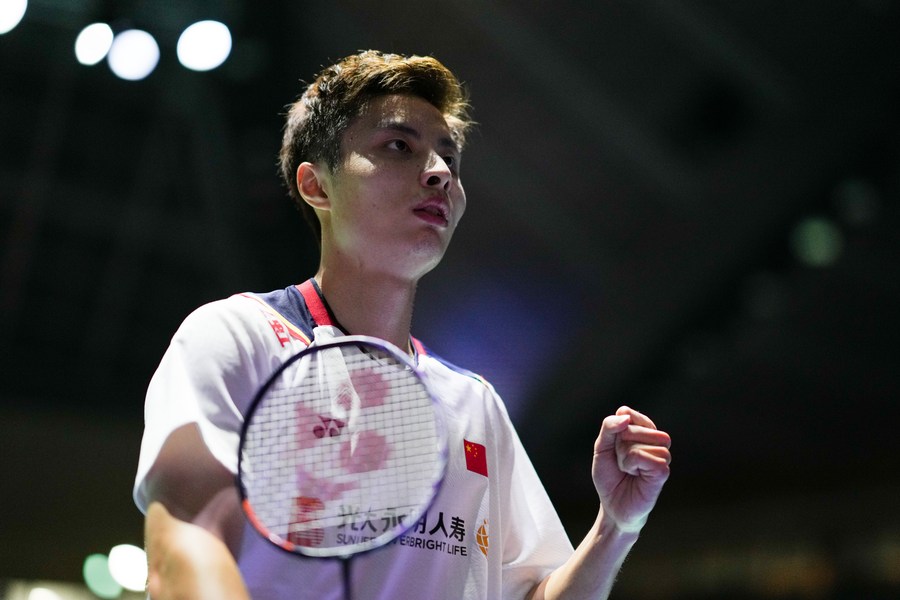 Shi Yuqi of China celebrates during his men's singles second round match against Rasmus Gemke of Denmark at the 2022 BWF World Championships in Tokyo, Japan, Aug. 23, 2022. (Xinhua/Zhang Xiaoyu)