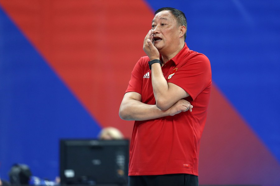 China coach Wu Sheng looks on during the FIVB Volleyball Nations League match against Bulgaria in Gdansk, Poland on July 9, 2022. (Photo by Piotr Matusewicz/Xinhua)