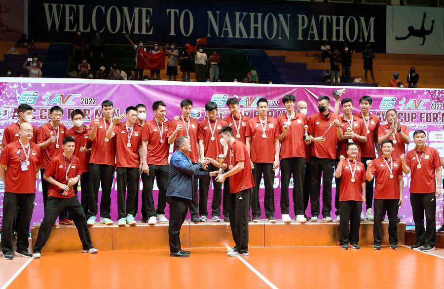 China celebrate after winning the 2022 AVC (Asian Volleyball Confederation) Cup final against Japan in Nakhon Pathom, Thailand, Aug. 14, 2022. (Xinhua/Wang Teng)