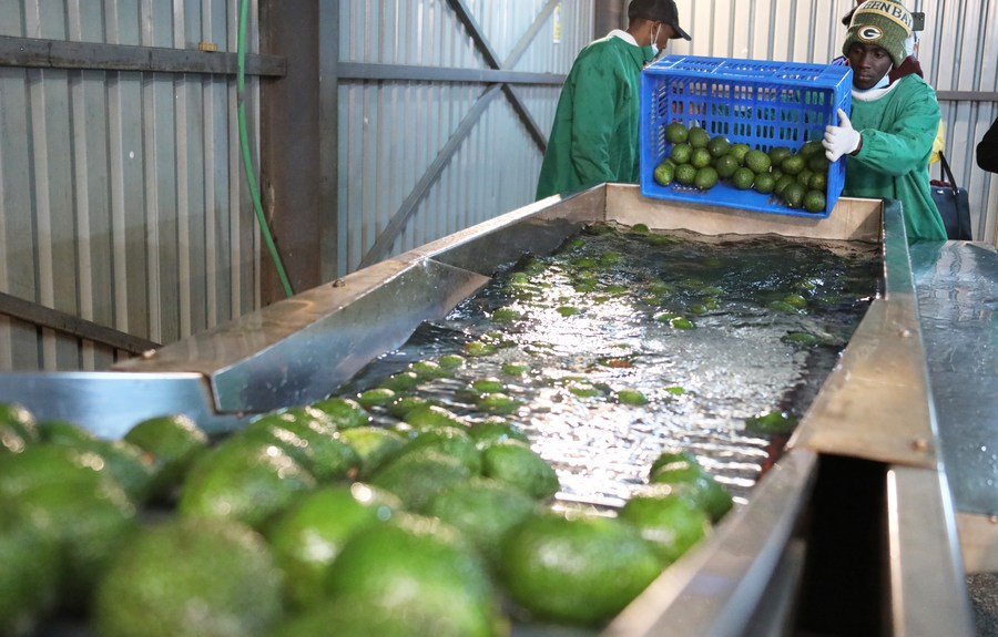 A staff member pours fresh avocados into water to wash them at Sunripe factory in Limuru Town, Kiambu County, Kenya, on August 2, 2022. Kenya became the first African country to export fresh avocados to China in a move set to further boost the economic ties between the two countries. (Xinhua/Dong Jianghui)