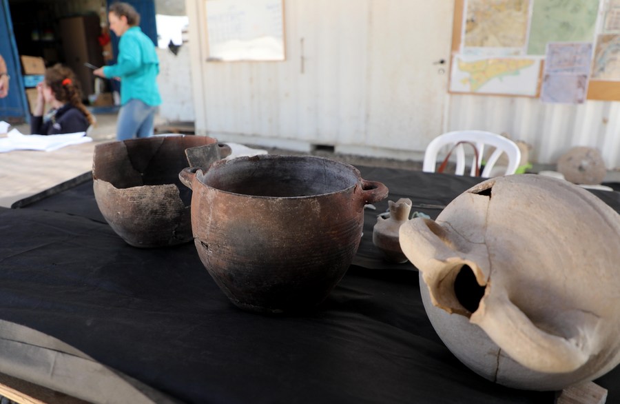 Photo taken on Aug, 23. 2022 shows wares unearthed at the site of a newly-discovered 1,200-year-old rural estate in the southern Israeli Bedouin city of Rahat in the Negev desert. (Photo by Gil Cohen Magen/Xinhua)