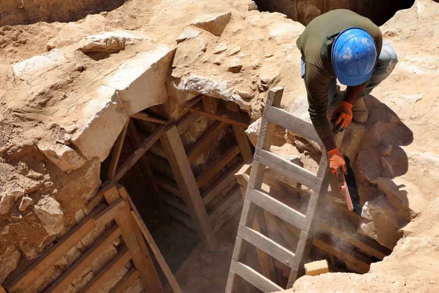 A staff member of the Israel Antiquities Authority works at the site of a newly-discovered 1,200-year-old rural estate in the southern Israeli Bedouin city of Rahat in the Negev desert, on Aug, 23. 2022. (Photo by Gil Cohen Magen/Xinhua)