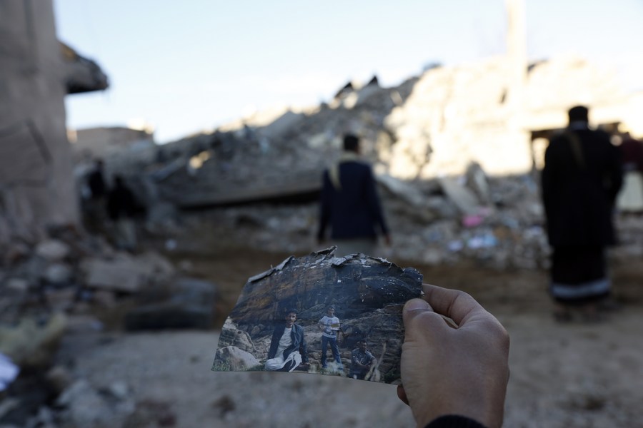 A man holds a family photo among the rubble of a house destroyed by airstrikes in Sanaa, Yemen, on Jan. 18, 2022. (Photo by Mohammed Mohammed/Xinhua)