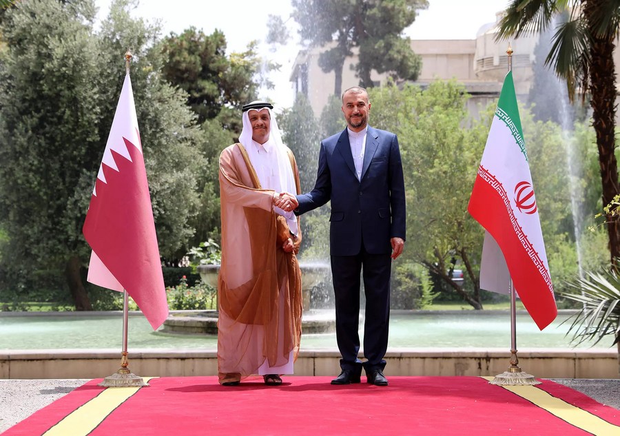 Iran's Foreign Minister Hossein Amir-Abdollahian (R) welcomes his visiting Qatari counterpart Mohammed bin Abdulrahman Al Thani in Tehran, Iran, July 6, 2022. (Iranian Foreign Ministry/Handout via Xinhua)