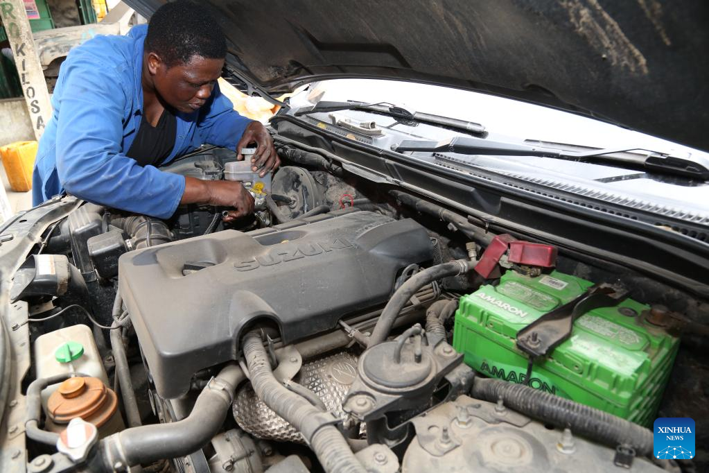 Jane Goodluck Isowe works at her car repair workshop at Magomeni Mwembechai in Dar es Salaam, the commercial capital of Tanzania, Aug. 22, 2022. (Photo by Herman Emmanuel/Xinhua)