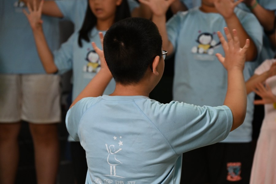 Eleven-year-old Binbin (front) teaches other kids sign language during a drama performance activity at a summer camp in Beijing, capital of China, Aug. 1, 2022. (Photo by Xiao Zhengyu/Xinhua)
