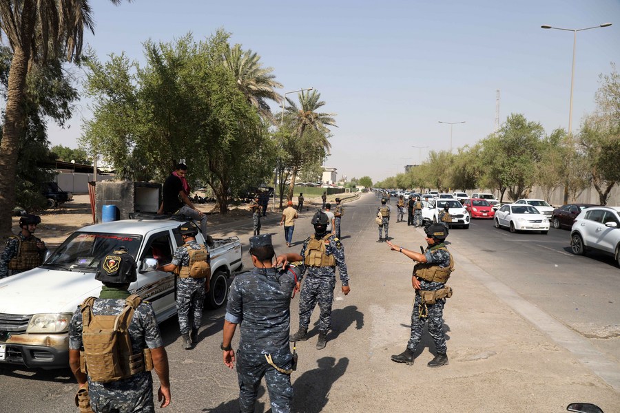 Iraqi security forces deployed in streets near the Supreme Judicial Council where Shiite cleric Moqtada al-Sadr's supporters hold a sit-in protest in Baghdad, Iraq, on Aug. 23, 2022. (Xinhua/Khalil Dawood)