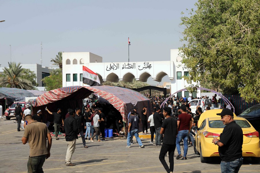 Iraqi shiite cleric Moqtada al-Sadr's supporters stage a sit-in protest in front of the Supreme Judicial Council in Baghdad, Iraq, on Aug. 23, 2022. (Xinhua/Khalil Dawood)