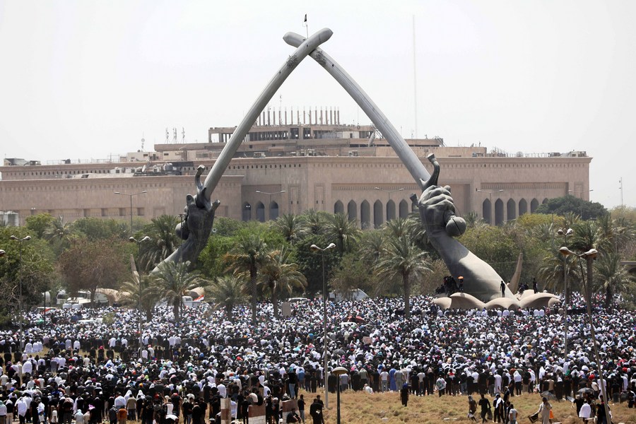Followers of Shiite cleric Moqtada al-Sadr gather on the Grand Festivities Square in the Green Zone in central Baghdad, Iraq, on Aug. 5, 2022. (Xinhua/Khalil Dawood)