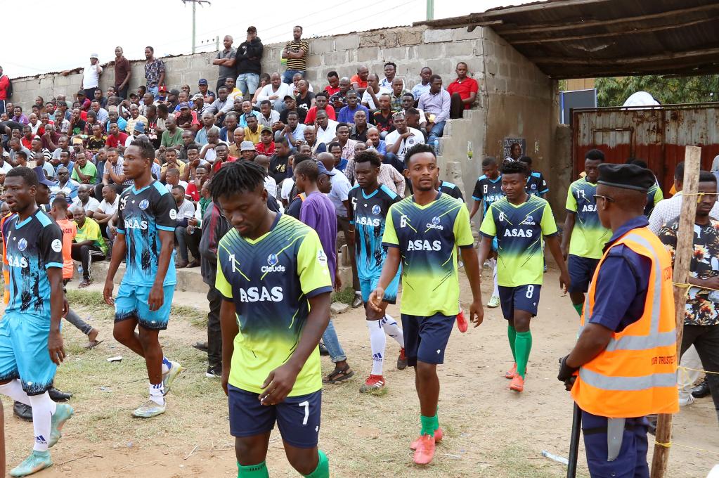 Players from street football clubs walk onto a football pitch before a match in Dar es Salaam, Tanzania, on Aug. 22, 2022. (Photo by Herman Emmanuel/Xinhua)