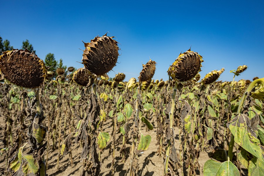 Photo taken on Aug. 15, 2022 shows a sun-scorched sunflower field amid heat wave in Slavonia, Croatia. (Davor Javorovic/Pixsell via Xinhua) ■