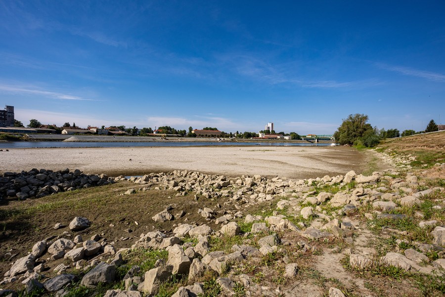 Photo taken on Aug. 16, 2022 shows the almost dried-out riverbed of Drava River in Osijek, Croatia. (Photo by Davor Javorovic/PIXSELL via Xinhua)