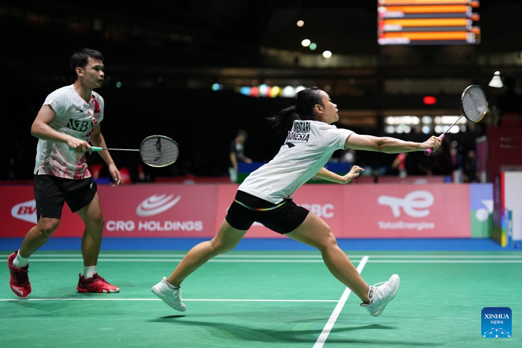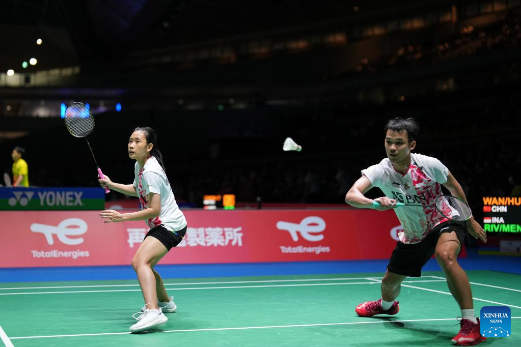 Rinov Rivaldy (R)/Pitha Haningtyas Mentari of Indonesia compete during the mixed doubles third round match against Wang Yilyu/Huang Dongping of China at the BWF World Championships 2022 in Tokyo, Japan, Aug. 25, 2022. (Xinhua/Zhang Xiaoyu)