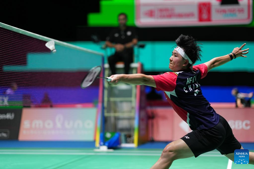 He Bingjiao of China hits a return during the women's singles third round match against Carolina Marin of Spain at the BWF World Championships 2022 in Tokyo, Japan, Aug. 25, 2022. (Xinhua/Zhang Xiaoyu)
