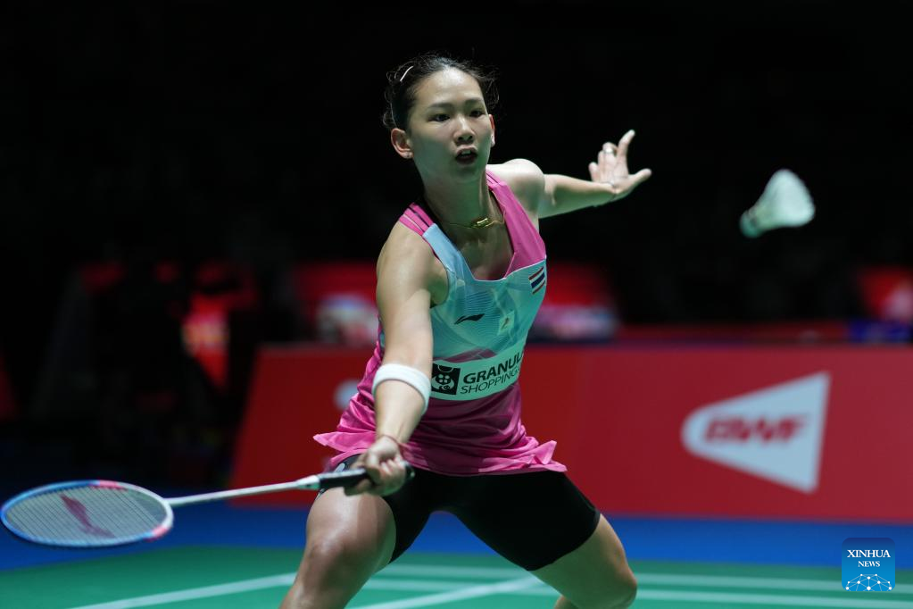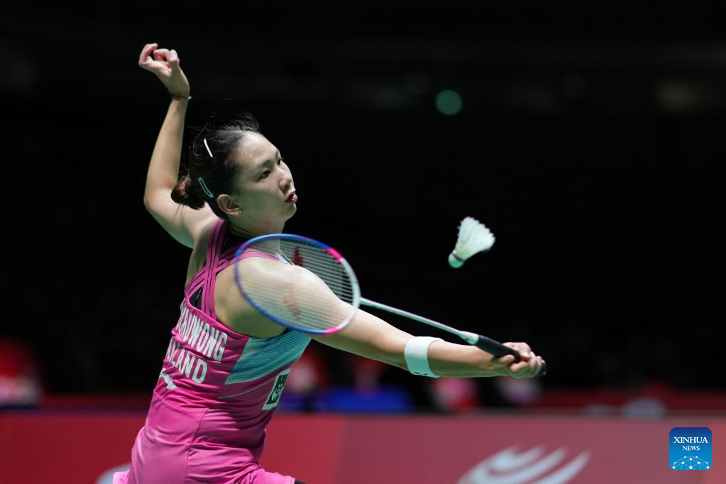 Pornpawee Chochuwong of Thailand hits a return during the women's singles third round match against Chen Yufei of China at the BWF World Championships 2022 in Tokyo, Japan, Aug. 25, 2022. (Xinhua/Zhang Xiaoyu)