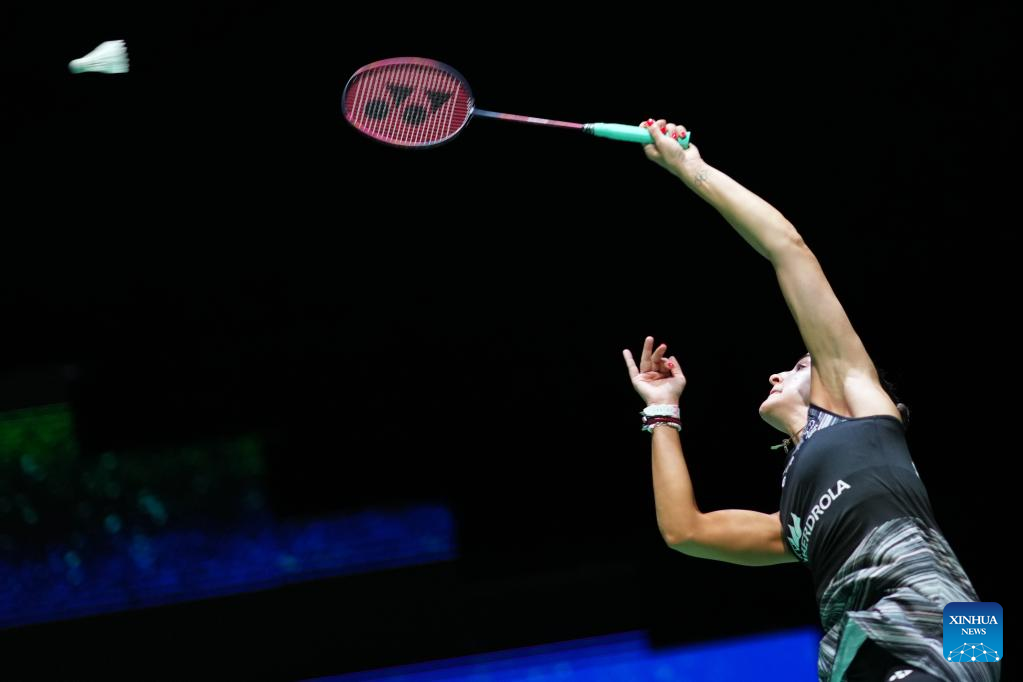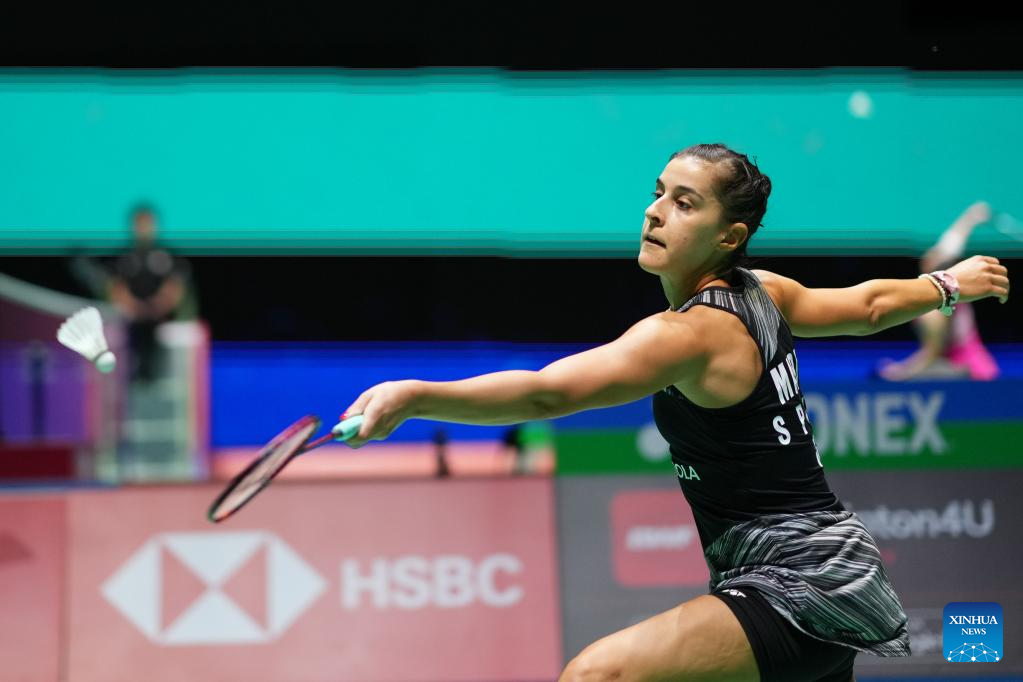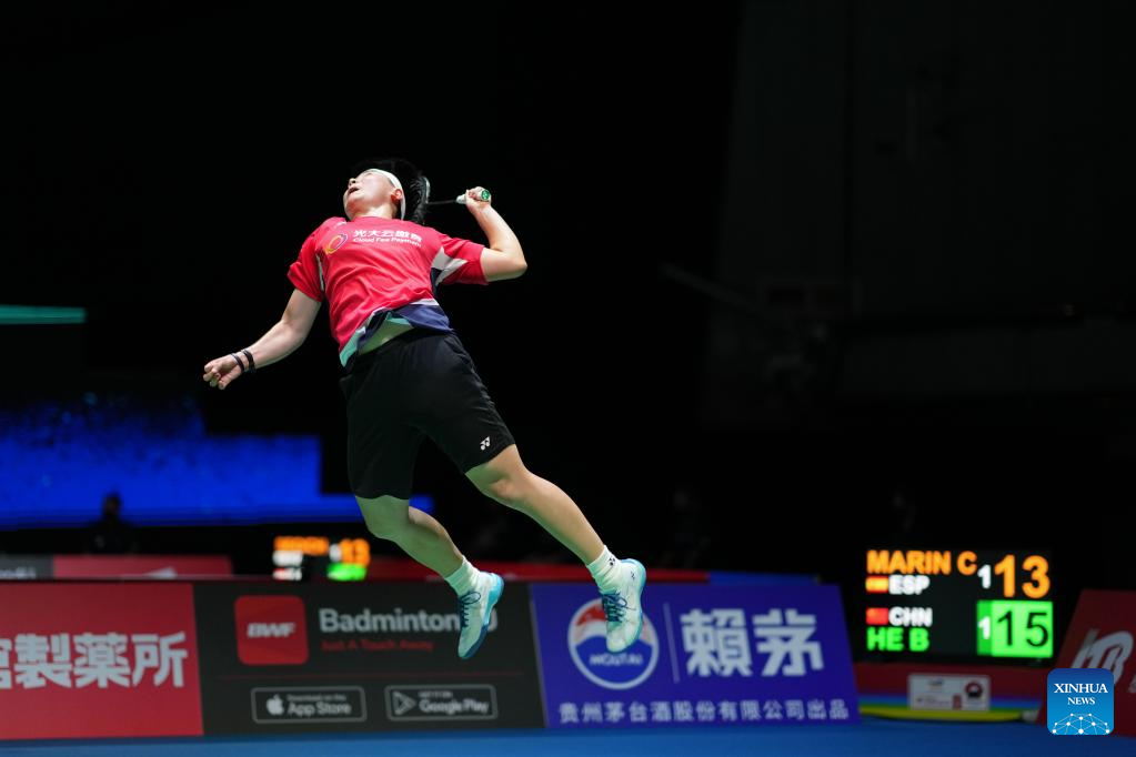 Carolina Marin of Spain hits a return during the women's singles third round match against He Bingjiao of China at the BWF World Championships 2022 in Tokyo, Japan, Aug. 25, 2022. (Xinhua/Zhang Xiaoyu)