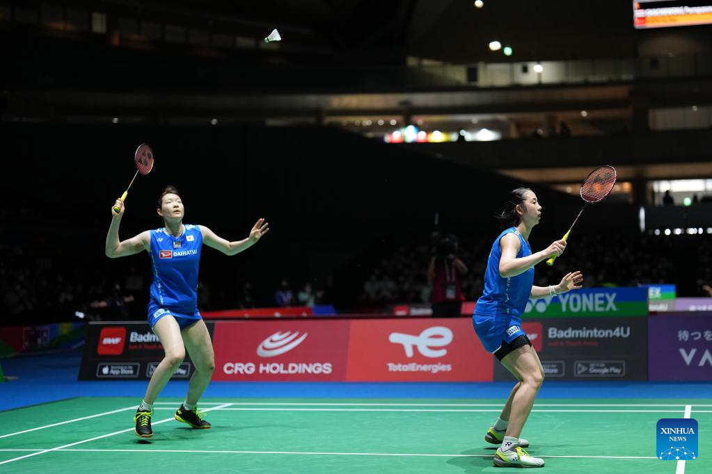 Matsumoto Mayu (R)/Nagahara Wakana of Japan compete during the women's doubles third round match against Du Yue/Li Wenmei of China at the BWF World Championships 2022 in Tokyo, Japan, Aug. 25, 2022. (Xinhua/Zhang Xiaoyu)
