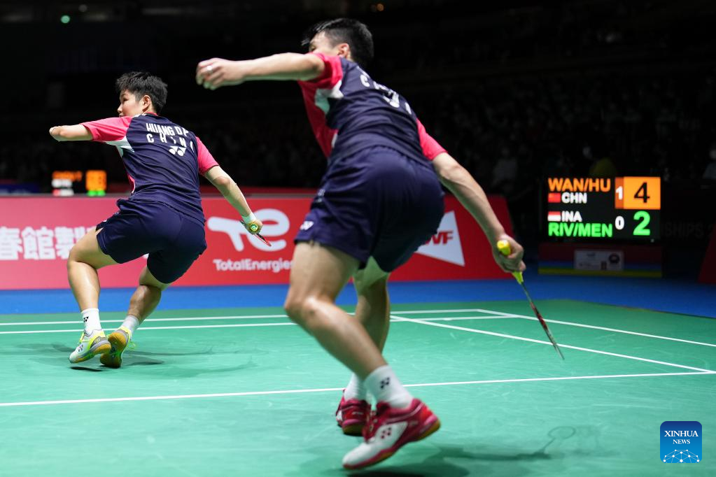Wang Yilyu (L) /Huang Dongping of China compete during the mixed doubles third round match against Rinov Rivaldy/Pitha Haningtyas Mentari of Indonesia at the BWF World Championships 2022 in Tokyo, Japan, Aug. 25, 2022. (Xinhua/Zhang Xiaoyu)