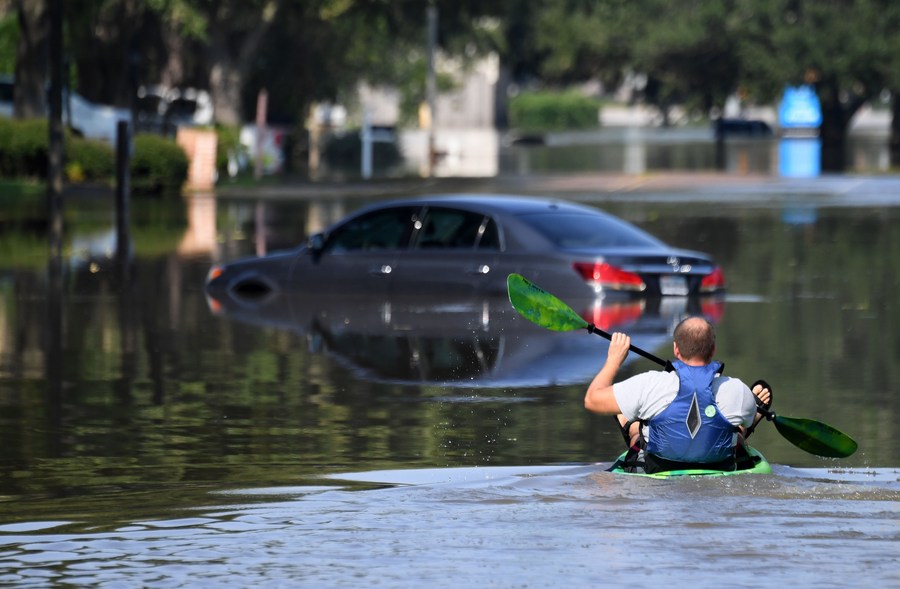 A man paddles on a flooded street near Barker Reservoir, west of Houston, Texas, the United States, Sept. 1, 2017. (Xinhua/Yin Bogu)
