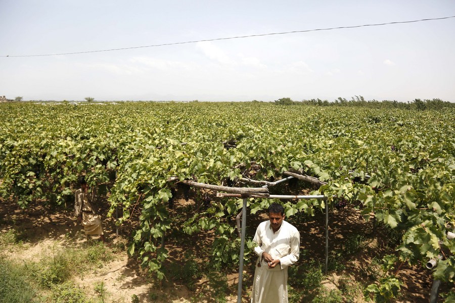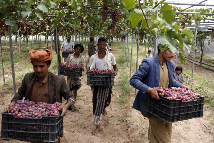 Yemeni farmers harvest grapes at a vineyard in the Bani Hushaysh area, 25 km to the east of the capital Sanaa, Yemen, Aug. 25, 2022. (Photo by Mohammed Mohammed/Xinhua)