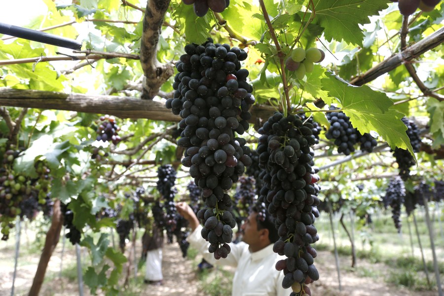 A Yemeni farmer harvests grapes at a vineyard in the Bani Hushaysh area, 25 km to the east of the capital Sanaa, Yemen, Aug. 25, 2022. (Photo by Mohammed Mohammed/Xinhua)