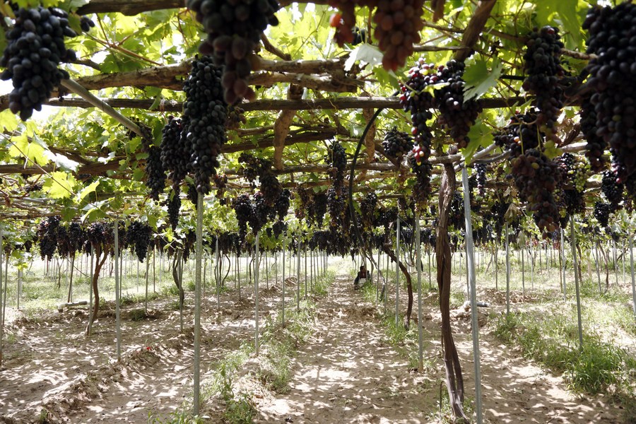 The picture shows a view of harvested grapes at a vineyard in the Bani Hushaysh area, 25 km to the east of the capital Sanaa, Yemen, on Aug. 25, 2022. (Photo by Mohammed Mohammed/Xinhua)