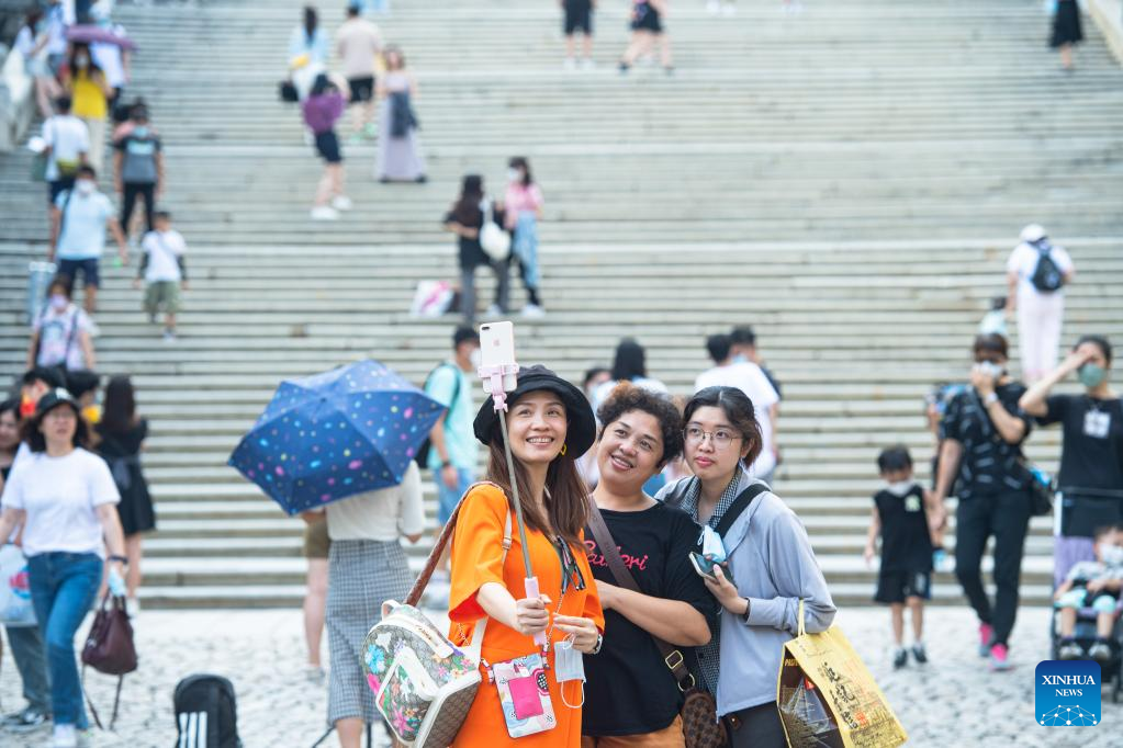 Visitors take selfies at the Ruins of St. Paul's in south China's Macao, Aug. 27, 2022. (Xinhua/Cheong Kam Ka)