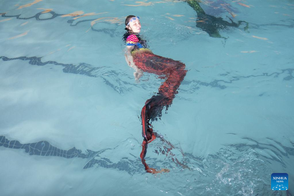A trainee practises mermaid swimming at the "Merschool" in Johannesburg, South Africa, Aug. 26, 2022. At the "Merschool" in Johannesburg, mermaid swimming courses are increasingly popular among South Africans. Dressed as mermaids and mermen, trainees here are expected to master both artistic swimming techniques and mermaiding mannerisms. (Photo by Shiraaz Mohamed/Xinhua)