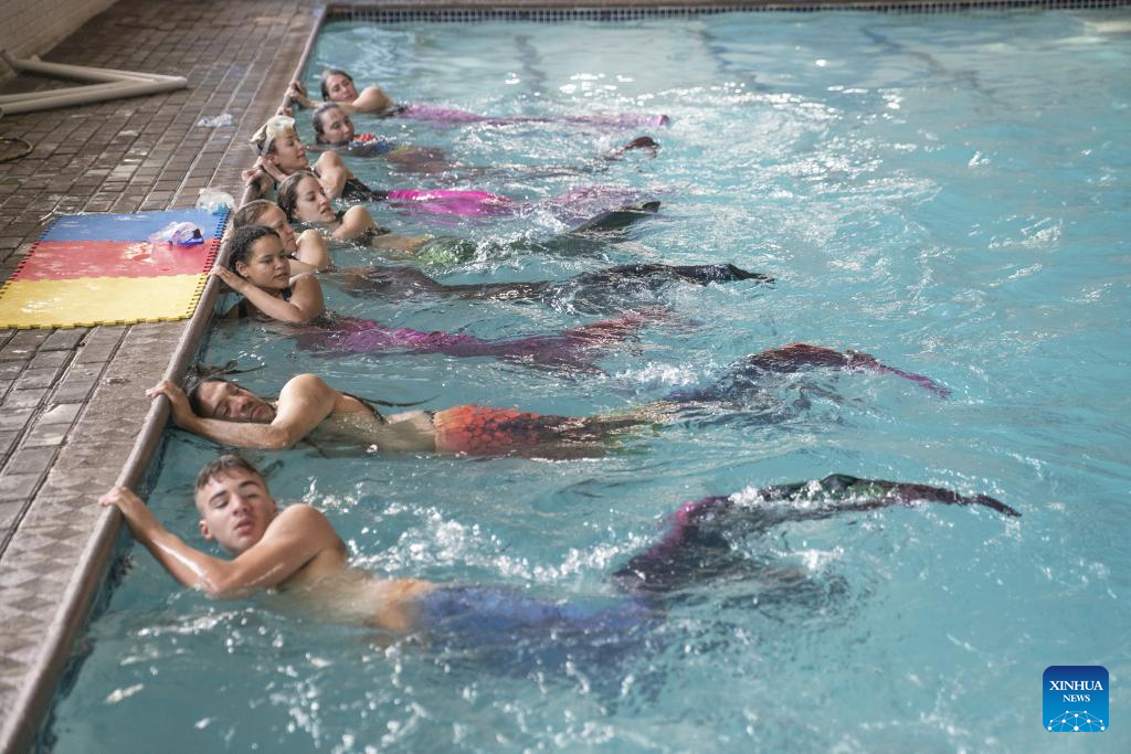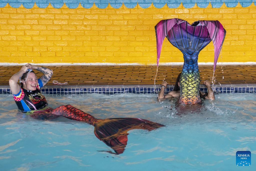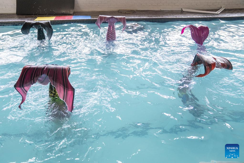 Trainees practise mermaid swimming at the "Merschool" in Johannesburg, South Africa, Aug. 26, 2022. At the "Merschool" in Johannesburg, mermaid swimming courses are increasingly popular among South Africans. Dressed as mermaids and mermen, trainees here are expected to master both artistic swimming techniques and mermaiding mannerisms. (Photo by Shiraaz Mohamed/Xinhua)