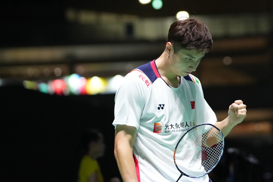 Shi Yuqi of China celebrates after scoring during the men's singles first round match against Ade Resky Dwicahyo of Azerbaijan at the BWF World Championships 2022 in Tokyo, Japan, Aug. 22, 2022. (Xinhua/Zhang Xiaoyu)