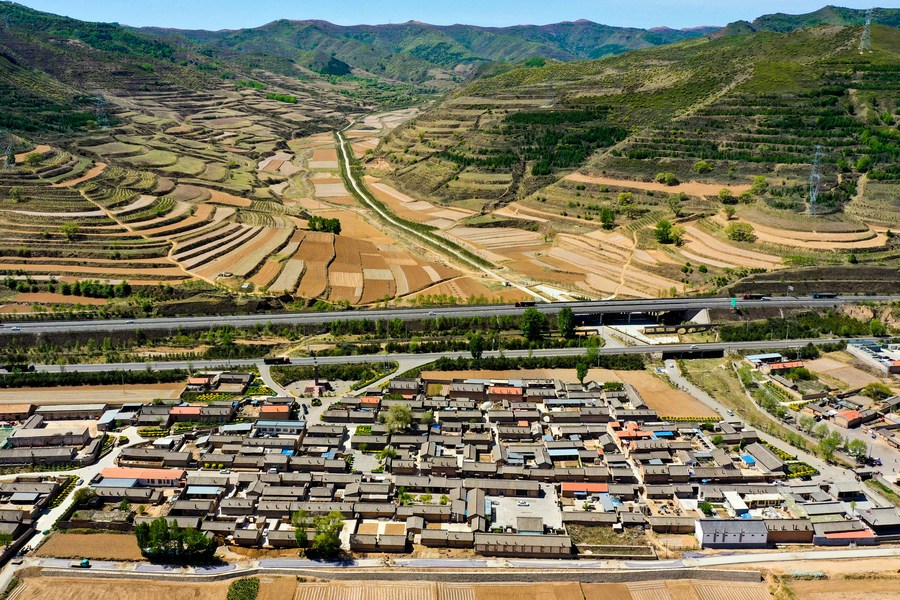Aerial photo taken on May 19, 2020 shows a view of Songjiagou New Village in Kelan County, north China's Shanxi Province. Kelan County is located in central area of Loess Plateau and the deep Lyuliang Mountains. (Xinhua/Cao Yang)