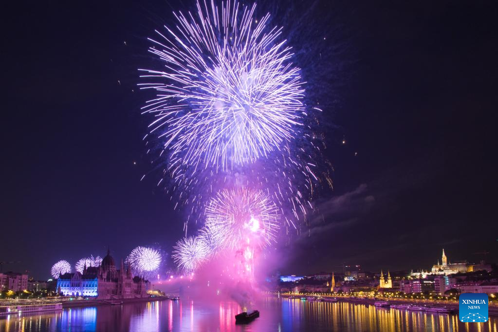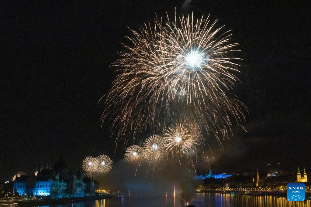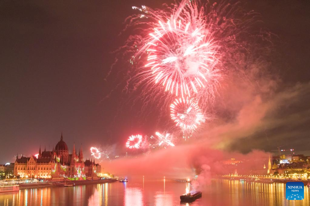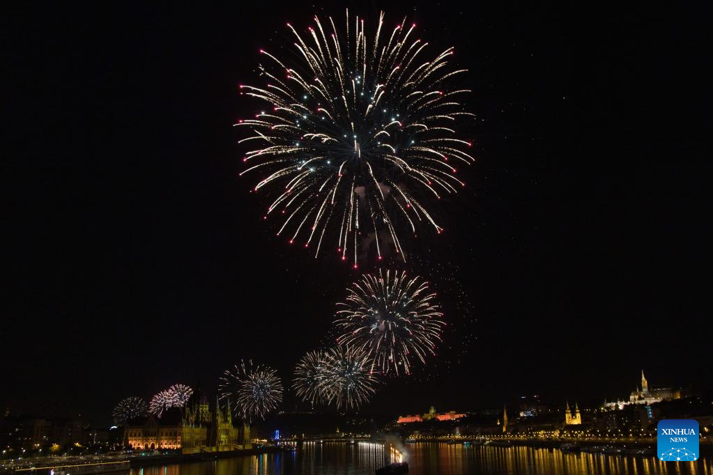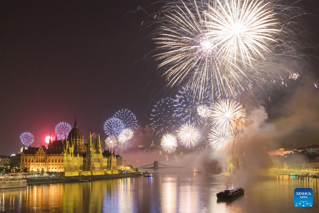 Fireworks explode to celebrate the Hungarian national holiday in Budapest, Hungary, Aug. 27, 2022. Hungary marked its national holiday Saturday with an airshow and grand fireworks over the Danube River with a delay of seven days, as the original celebration had been cancelled due to thunderstorm warning by the Hungarian Meteorological Service (OMSZ). (Photo by Attila Volgyi/Xinhua)