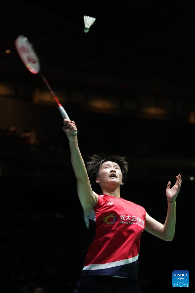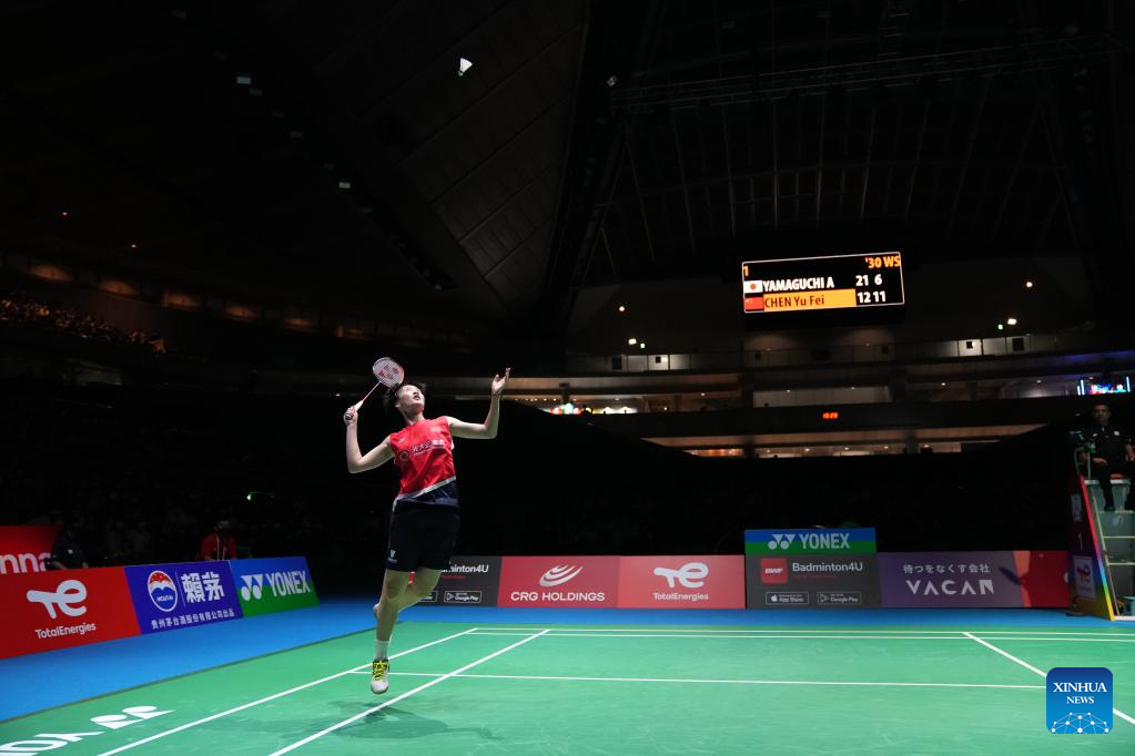 Chen Yufei of China hits a return during the women's singles final against Yamaguchi Akane of Japan at the BWF World Championships 2022 in Tokyo, Japan, Aug. 28, 2022. (Xinhua/Zhang Xiaoyu)
