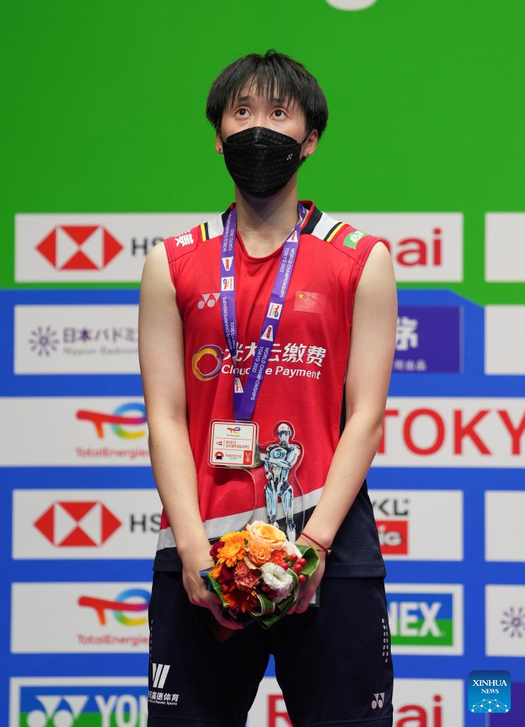 Chen Yufei of China poses on the podium for the women's singles at the BWF World Championships 2022 in Tokyo, Japan, Aug. 28, 2022. (Xinhua/Zhang Xiaoyu)