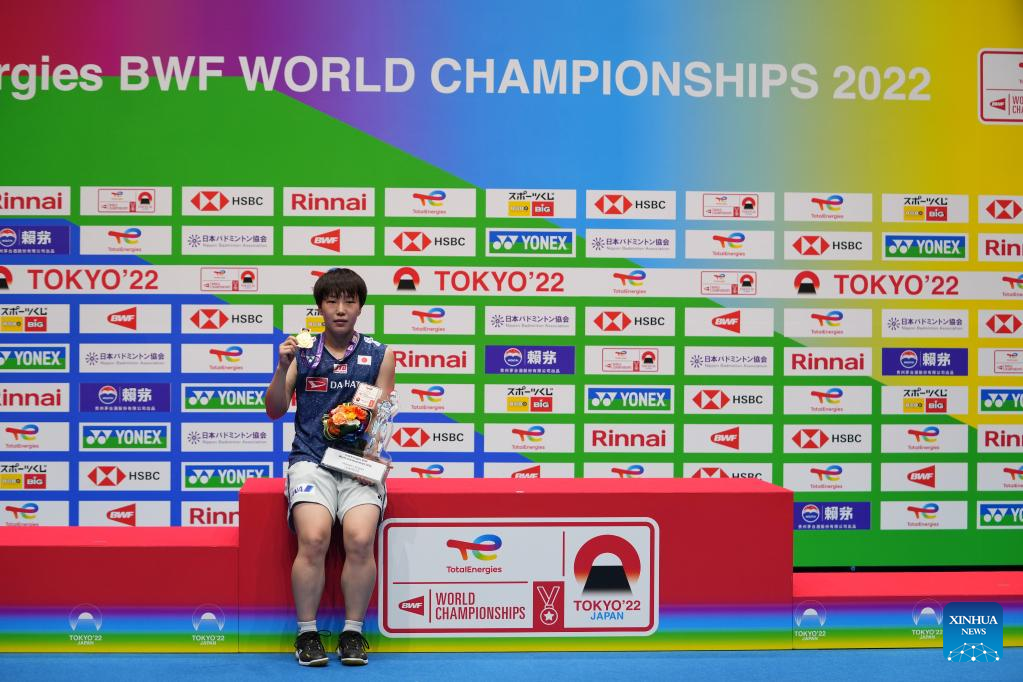 Yamaguchi Akane of Japan poses on the podium for the women's singles at the BWF World Championships 2022 in Tokyo, Japan, Aug. 28, 2022. (Xinhua/Zhang Xiaoyu)