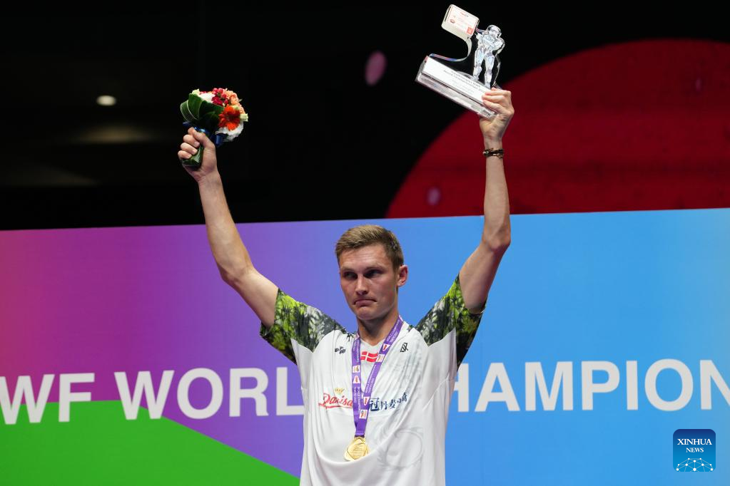 Viktor Axelsen of Denmark poses on the podium during the awarding ceremony for the men's singles at the BWF World Championships 2022 in Tokyo, Japan, Aug. 28, 2022. (Xinhua/Zhang Xiaoyu)