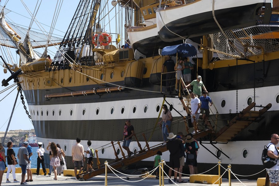 People visit the Italian Navy training ship Amerigo Vespucci in Valletta, Malta, Aug. 27, 2022. (Photo by Jonathan Borg/Xinhua)