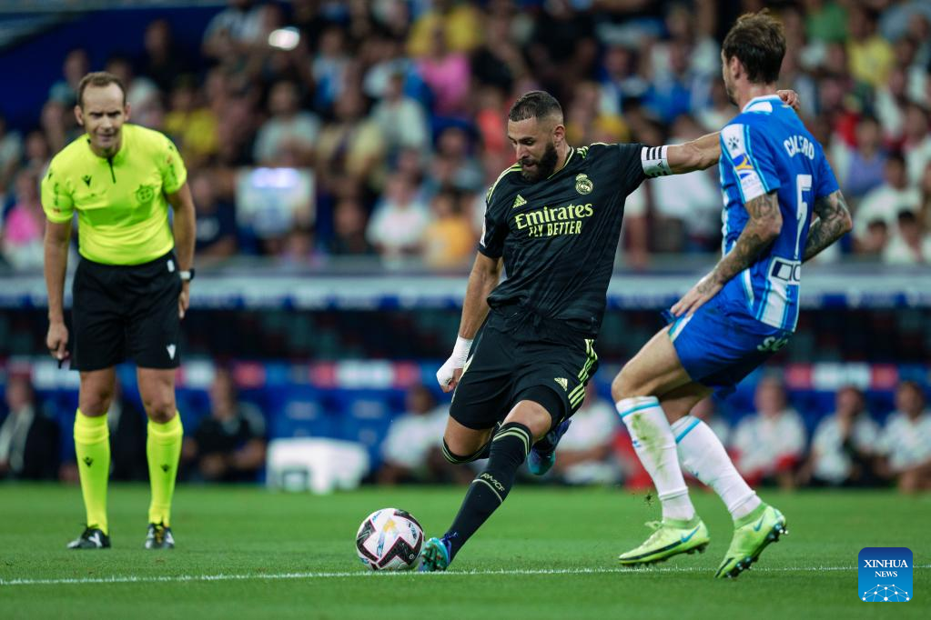 Real Madrid's Karim Benzema (C) shoots the ball during a La Liga Santander match between RCD Espanyol and Real Madrid in RCDE Stadium, Barcelona, Spain, on Aug. 28, 2022. (Photo by Joan Gosa/Xinhua)