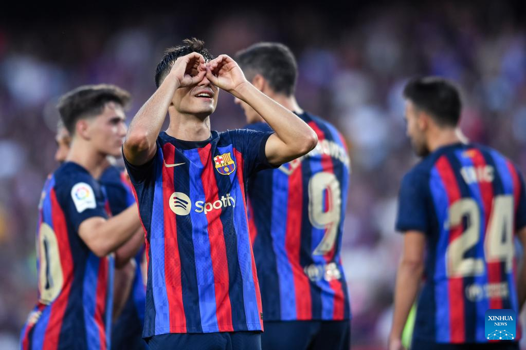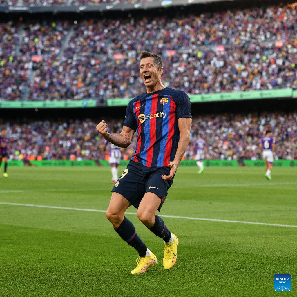 Barcelona's Robert Lewandowski celebrates a goal during a La Liga Santander match between FC Barcelona and Real Valladolid CF in Camp Nou, Barcelona, Spain, on Aug. 28, 2022. (Str/Xinhua)