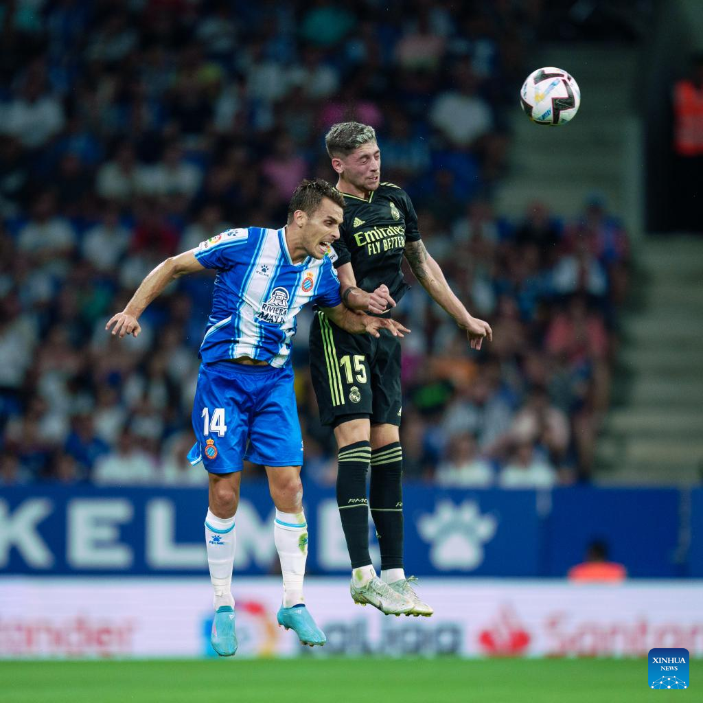 Real Madrid's Federico Valverde (R) vies with Espanyol's Brian Olivan during a La Liga Santander match between RCD Espanyol and Real Madrid in RCDE Stadium, Barcelona, Spain, on Aug. 28, 2022. (Photo by Joan Gosa/Xinhua)