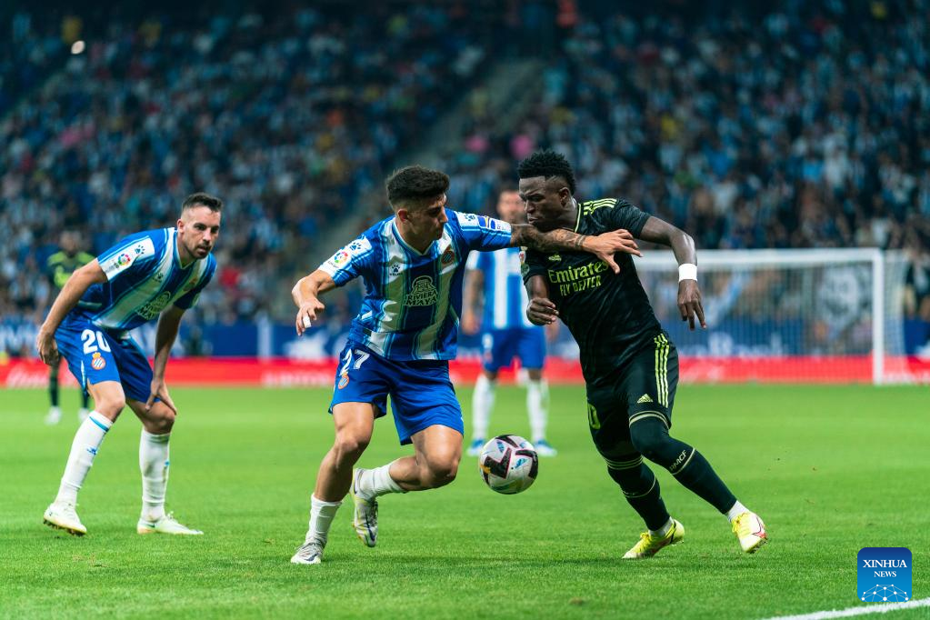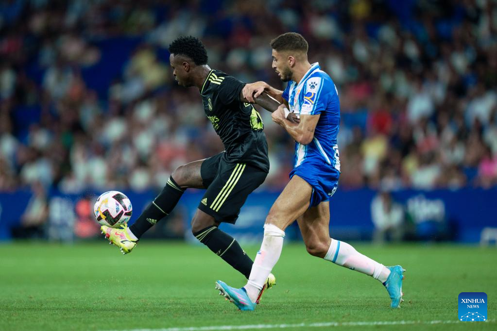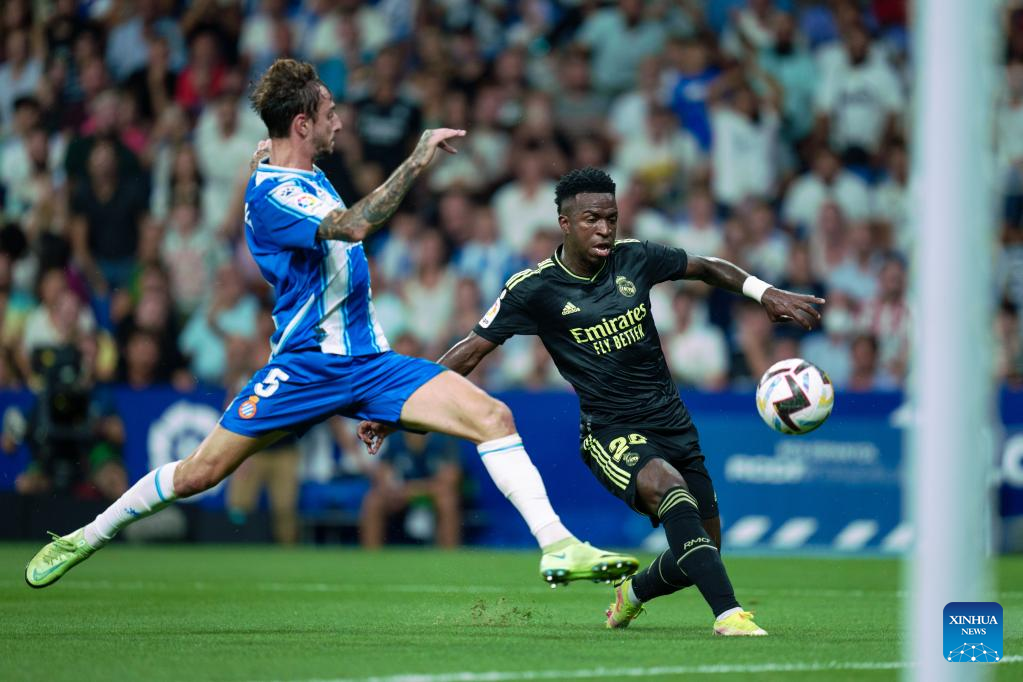 Real Madrid's Vinicius Jr. (R) shoots the ball during a La Liga Santander match between RCD Espanyol and Real Madrid in RCDE Stadium, Barcelona, Spain, on Aug. 28, 2022. (Photo by Joan Gosa/Xinhua)